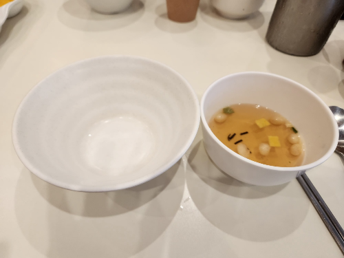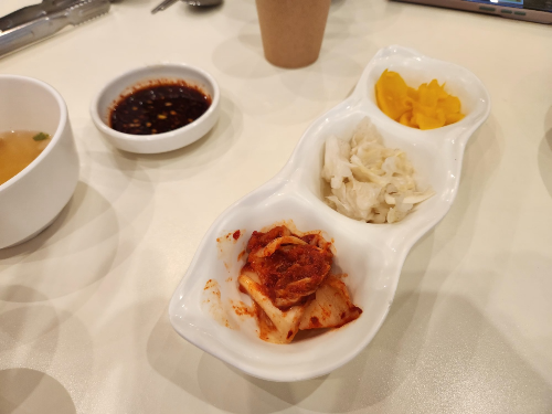 기본 찬으로 국물, 김치, 백김치, 단무지, 간장이 나와요